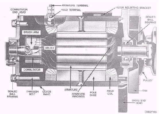 The current is collected from the armature coils by brushes (usually made of carbon) that make rubbing contact with a commutator. The commutator consists of a series of insulated copper segments mounted on one end of the armature, each segment connecting to one or more armature coils. The armature coils are connected to the external circuits (battery, lights, or ignition) through the commutator and brushes. Current induced in the armature coils thus is able to flow to the external circuits. There are two types of field circuits, determined by the point at which the field circuit is grounded, which are as follows: One circuit, referred to as the "A" circuit, shunts the field current from the insulated brushes through the field winding grounding externally at the regulator. In the other, the "B" circuit, the field current is shunted from the armature series winding in the regulator to the generator field windings, grounding internally within the generator. The three basic design factors that determine generator output are (1) the speed of armature rotation, (2) the number of armature conductors, and (3) the strength of the magnetic field. Any of these design factors could be used to control the generator voltage and current. However, the simplest method is to determine the strength of the magnetic field and thus limit the voltage and current output of the generator. |