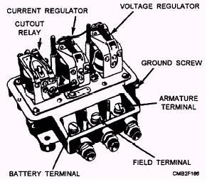 The fields of the generator depend upon the current from the armature of the generator for magnetization. Because the current developed by the generator increases in direct proportion to its speed, the fields become stronger as the speed increases and, correspondingly, the armature generates more current. The extreme variations in speed of the automotive engine make it necessary to regulate output of the generator to prevent excessive current or voltage overload. On the average unit of CESE, a charging current in excess of 12 to 15 amperes is harmful to a fully charged battery if continued for too long. Regulators are of two types, functioning to regulate either voltage or current. The voltage regulator regulates the voltage in the electric system and prevents excessive voltage, which can cause damage to the electric units and overcharge the battery. The current regulator is a current limiter; it prevents the generator output from increasing beyond the rated output of the generator. Regulation of voltage only might be satisfactory from the standpoint of the battery; however, if the battery were badly discharged or if a heavy electrical load were connected, the heavy current might overload itself to supply the heavy current demand. Therefore, both current and voltage controls are used in a charging system. In most applications, a regulator assembly consists of a cutout relay, current regulator, and voltage regulator (fig. 2-13). Each unit contains a separate core, coil, and set of contacts. The regulator assembly provides full control of the shunt-type generator under all conditions. Either the current regulator or the voltage regulator may be operating at any one time, but in no case do they both operate at the same time. When the electric load requirements are high and the battery is low, the current regulator will operate to prevent the generator output from exceeding its safe maximum. In this case, the voltage is not sufficient to cause the voltage regulator to operate. But if the load requirements are reduced or the battery begins to come up to charge, the line voltage will increase to a value sufficient to cause the voltage regulator to operate. When this happens, the generator output is reduced; it is no longer sufficiently high to cause the current regulator to operate. All regulation is then dependent on the voltage regulator. Figure 2-14 shows a schematic wiring diagram of a typical dc charging circuit. In this circuit, two resistances are connected in
