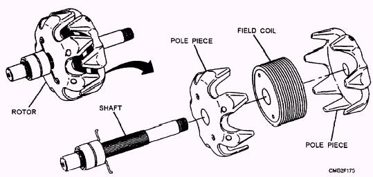The primary components of an alternator are as follows: ROTOR ASSEMBLY (rotor shaft, slip rings, claw poles, and field windings) STATOR ASSEMBLY (three stator windings or coils, output wires, and stator core) RECTIFIER ASSEMBLY (heat sink, diodes, diode plate, and electrical terminals) ROTOR ASSEMBLY (fig. 2-22).- The rotor consists of field windings (wire wound into a coil placed over an iron core) mounted on the rotor shaft. Two claw-shaped pole pieces surround the field windings to increase the magnetic field. The fingers on one of the claw-shaped pole pieces produce south (S) poles and the other produces north (N) poles. As the rotor rotates inside the alternator, alternating N-S-N-S polarity and ac current is produced (fig. 2-23). An external source of electricity is required to excite the magnetic field of the alternator. Slip rings are mounted on the rotor shaft to provide current to the rotor windings. Each end of the field coil connects to the slip rings. STATOR ASSEMBLY (fig. 2-24).- The stator produces the electrical output of the alternator. The stator, which is part of the alternator frame when assembled, consists of three groups of windings or coils which produce three separate ac currents. This is known as three-phase output. One end of the windings is connected to the stator assembly and the other is connected to a rectifier assembly. The windings are