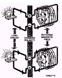Figure 2-23.- Simple alternator illustrating reversing magnetic field and resulting current flow.
