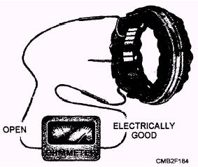 Figure 2-31.- Testing a stator for opens. DIODE TESTING.- With the stator windings disconnected, each diode may be tested with an ohmmeter or with a test light. To perform the test with an ohmmeter, proceed as follows: Connect one ohmmeter test lead to the diode lead and the other to the diode case (fig. 2-33). Note the reading. Then reverse the ohmmeters leads to the diode and again note the reading. If both readings are very low or very high, the diode is defective. A good diode will give one low and one high reading. An alternate method of testing each diode is to use a test lamp with a 12-volt battery. To perform a test with a test lamp, proceed as follows: Connect one of the test leads to the diode lead and the other test lead as shown in figure 2-34. Then reverse the lead connections. If the lamp lights in both checks, the diode is defective. Or, if the lamp fails to light in either direction, the