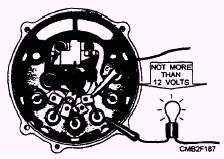 Figure 2-34.- Testing diodes with a test lamp. diode is defective. When a good diode is being tested, the lamp will light in only one of the two checks. After completing the required test and making any necessary repairs or replacement of parts, reassemble the alternator and install it on the vehicle. After installation, start the engine and check that the charging system is functioning properly. NEVER ATTEMPT TO POLARIZE AN ALTERNATOR. Attempts to do so serves no purpose and may damage the diodes, wiring, and other charging circuit components. |
