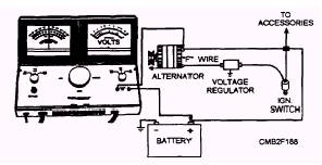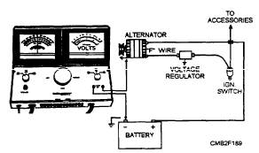 INSULATED RESISTANCE TEST.- To perform an insulated resistance test, connect the load tester as described by the manufacturer. A typical connection setup is shown in figure 2-35. Note how the voltmeter is connected across the alternator output terminal and positive battery terminal. With the vehicle running at a fast idle, rotate the load control knob to obtain a 20-amp current flow at 15 volts or less. All accessories and lights are to be turned OFF. Read the voltmeter. The voltmeter should NOT read over 0.7-volt drop (0.1 volt per electrical connection) for the circuit to be considered in good condition. However, if the voltage drop is over 0.7 volt, circuit resistance is high and a poor electrical connection exists. GROUND CIRCUIT RESISTANCE TEST.- With the ground circuit resistance test the voltmeter leads are placed across the negative battery terminal and alternator housing (fig. 2-36). The voltmeter should NOT read over 0.1 volt per electrical connection. If the reading is higher, this indicates such problems as loose or faulty connections, burnt plug sockets, or other similar malfunctions.
