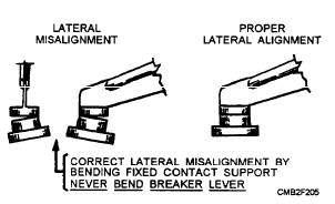 Figure 2-52.- Contact point alignment. CAUTION To use a dwell meter for adjusting contact points, connect the red lead of the dwell meter to the distributor side of the ignition coil (wire going to the contact points). Connect the black lead to ground. If the distributor cap has an adjustment window, the points should be set with the engine running. With the meter controls set properly, adjust the points through the window of the distributor cap using a Allen wrench or a special screwdriver. Turn the point adjustment screw until the dwell meter reads within manufacturer's specification. However, if the distributor cap does not have an adjustment window, remove the distributor cap and ground the ignition coil wire. Then crank the engine; this action will simulate engine operation and allow point adjustment with the dwell meter. Dwell specifications vary with the number of cylinders. An eight-cylinder engine requires 30 degrees of dwell. An engine with few cylinders requires more dwell time. Always consult the manufacturer's service manual for exact dwell values. Dwell should remain constant as engine speed increases or decreases. However, if the distributor is worn, you can have a change in the dwell meter reading. This is known as DWELL VARIATION. If dwell varies more than 3 degrees, the distributor should either be replaced or rebuilt. Also, a change in the point gap or dwell will change ignition timing. For this reason, the points should always be adjusted before ignition timing. |