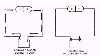 Figure 1-8.- Diode operation. increases to 6 volts or more, the diode suddenly will begin to conduct reverse bias current. This device is used in control circuits, such as voltage regulators. |