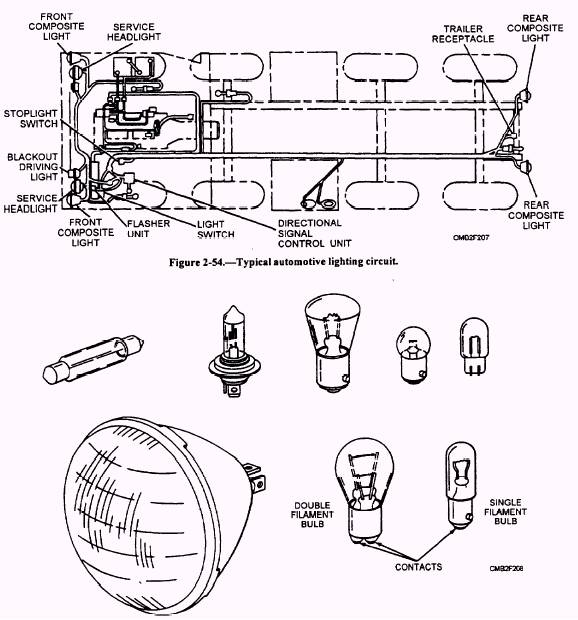 Learning Objective: Identify lighting-circuit components, their functions, and maintenance procedures. The lighting circuit (fig. 2-54) includes the battery, vehicle frame, all the lights, and various switches that control their use. The lighting circuit is known as a single-wire system since it uses the vehicle frame for the return. The complete lighting circuit of a vehicle can be broken down into individual circuits, each having one or more lights and switches. In each separate circuit, the lights are connected in parallel, and the controlling switch is in series between the group of lights and the battery. The marker lights, for example, are connected in parallel and are controlled by a single switch. In some installations, one switch controls the connections to the battery, while a selector switch determines which of two circuits is energized. The headlights, with their high and low beams, are an example of this type of circuit. In some instances, such as the courtesy lights, several switches may be connected in parallel so that any switch may be used to turn on the light. When a wiring diagram is being studied, all light circuits can be traced from the battery through the ammeter to the switch (or switches) to the individual light.