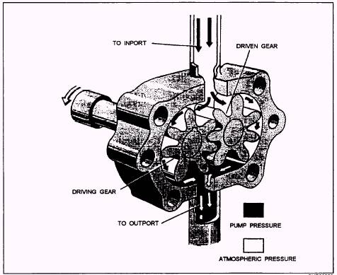 Figure 3-7.- Gear-type rotary pump. to minimize slippage from the discharge side back to the suction side. They are designed to operate at relatively moderate speeds. Operating at high speeds causes erosion and excessive wear which results in increased clearances. There are numerous types of rotary pumps and various methods of classification. They may be classified by shaft position- either vertically or horizontally mounted; the type of drive- electric motor, gasoline engine, and so forth; their manufacturer's name; or service application. However, classification of rotary pumps is generally made according to the type of rotating element. RECIPROCATING PUMPS.- The term reciprocating is defined as back-and-forth motion. In a reciprocating pump, it is the back-and-forth motion of pistons inside of cylinders that provides the flow of fluid. Reciprocating pumps, like rotary pumps, operate on the positive principle; that is, each stroke delivers a definite volume of liquid to the system. The most common type of reciprocating pump is the hand pump (fig. 3-13). There are two types of manually operated reciprocating pumps- single action and double action. The single-action pump provides flow during every other stroke, while the double-action provides flow during each stroke. Single-action pumps are frequently used in hydraulic jacks. Several types of power-operated hydraulic pumps, such as the radial piston (fig. 3-14) and axial piston (figs. 3-15 and 3-16), are classified as reciprocating pumps. These pumps are sometimes classified as rotary pumps, because a rotary motion is imparted to the pumps by the source of power. However, the actual pumping is performed by sets of pistons reciprocating inside sets of cylinders. |