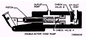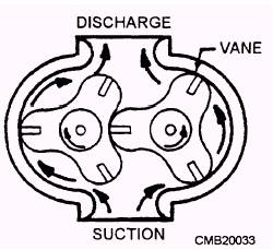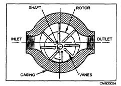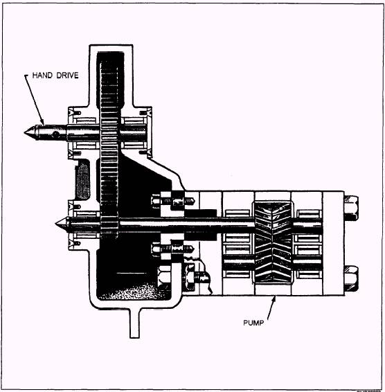 Figure 3-8.- Herringbone gear pump. Valves must be accurate in the control of fluid flow and pressure and the sequence of operation. Leakage between the valve element and the valve seat is reduced to a negligible quantity by precision-machined surfaces, resulting in carefully controlled clearances. This is one of the very important reasons for minimizing contamination in the system. Valves may be controlled manually, electrically, pneumatically, mechanically, hydraulically, or by combinations of two or more methods. Factors that determine the method of control include the purpose of the valve, the design and purpose of the system, the location of the valve within the system, and the availability of the source of power. Valves are classified according to their use: flow control, pressure control, and directional control. Some of these valves have multiple functions that fall into more than one classification.