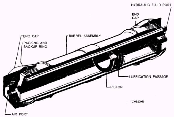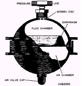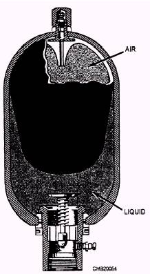 In most cases, the gas is separated from the oil by a piston (fig. 3-31), a bladder (fig. 3-32), or a diaphragm (fig. 3-33). This prevents mixing of gas and oil, keeping gas out of the hydraulic system. WEIGHT-LOADED ACCUMULATORS.- The weight-loaded accumulator uses a piston and cylinder along with heavy weights on the piston for loading or charging the oil. It is loaded by gravity and operation is very basic. The pressure oil in the hydraulic circuit is pushed into the lower section of the cylinder, raising the piston and weights. The accumulator is now charged and ready for work. When oil is needed, pressure drops in the system and gravity