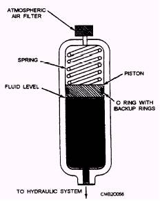Figure 3-34.- Spring-loaded accumulator. Motors Motors have many uses in fluid power systems. In hydraulic power drives, pumps and motors are combined with suitable lines and valves to form hydraulic transmissions. Fluid motors may either be fixed-or variable-displacement. Fixed-displacement motors provide constant torque and variable speed. Controlling the amount of input flow varies the speed. Variable-displacement motors are constructed so that the working relationship of the internal parts can be varied to change displacement. The majority of the motors used in fluid power systems are the fixed-displacement type. Fluid motors are usually classified according to the type of internal element that is directly actuated by the flow. The most common element are the gear (fig. 3-7), the vane (fig. 3-12), and the piston (fig. 3-15). |
