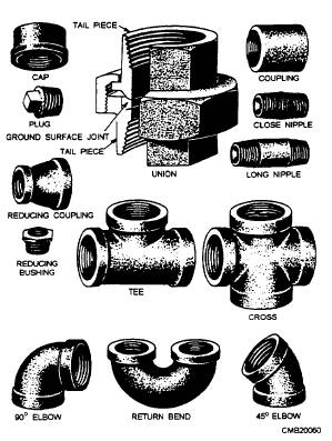 Figure 3-38.- Threaded pipe connectors. Another material used on pipe thread is sealant tape, made by TEFLON TM . This tape is made of polytetraflouroethylene (PTFE), which provides an effective means of sealing pipe connections and eliminates the need of having to torque connections to excessively high values to prevent leakage. It also provides for ease in maintenance whenever it is necessary to disconnect pipe joints. FLARED-TUBE CONNECTORS.- Flared-tube connectors are commonly used in circulatory systems consisting of lines made of tubing. These connectors provide safe, strong, dependable connections without the necessity of threading, welding, or soldering the tubing. The connector consists of a fitting, a sleeve, and a nut (fig. 3-39). The fittings are made of steel, aluminum alloy, or bronze. The fitting used in a connection should be made of the same material as that of the sleeve, the nut, and the tubing. For example, use steel connectors with steel tubing and aluminum alloy connectors with aluminum alloy tubing. Fittings are made in union, 45- degree and 90-degree elbows, tees and various other shapes (fig. 3-40). Tubing used with flare connectors must be flared before assembly. The nut fits over the sleeve, and when tightened, draw the sleeve and tubing flare tightly against the male fitting to form a seal. The male fitting has a cone-shaped surface with the same angle as the inside of the flare. The sleeve supports the tube so vibration does not concentrate at the edge of the flare and distributes the shearing action over a wider area for added strength. Correct and incorrect methods of installing flared-tube connectors are shown in figure 3-41. Tubing nuts should be tightened with a torque wrench to the value specified in applicable technical manuals. |