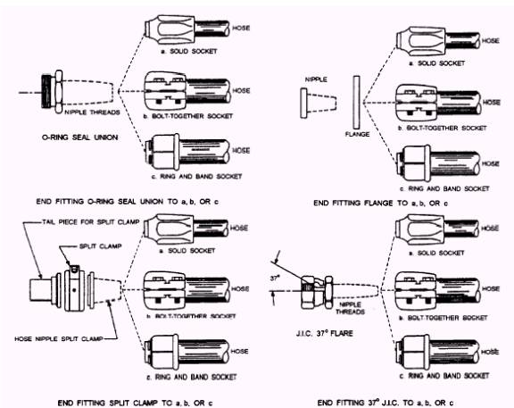 Figure 3-43.- End fittings and hose fittings. Reusable hose fittings are pushed on, screwed on, or clamped onto the hose. When the hose wears out, the fittings can be removed and used on a new hose that is cut from stock. Many fittings can be converted to another thread type by changing the nipple in the socket. NOTE QUICK-DISCONNECT COUPLERS.- Quick disconnect couplers are used where oil lines must be connected or disconnected frequently. They are self-sealing devices and do the work of two shutoff valves and a tube coupler. These couplers are fast, easy to use, and keep oil loss at aminimum. More importantly, there is no need to drain or bleed the system every time a hookup is required. However, dust plugs must be used when the coupler is disconnected. |