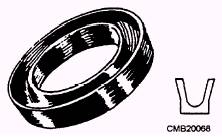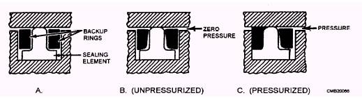 No hydraulic circuit can operate without the proper seals to hold the fluid under pressure in the system. Seals also keep dirt and other foreign materials out of the system. Hydraulic seals appear to be simple objects when held in the hand but, in use, they are highly complex; precision parts must be treated carefully if they are to do their job properly. Hydraulic seals are used in the following two main applications: 1. Static seals are used to seal fixed parts. Static seals are usually gaskets, but also may be O-rings or packings. 2. Dynamic seals are used to seal moving parts. Dynamic seals include shaft and rod seals and compression packings. A slight leakage in these seals is acceptable for seal lubrication. SEALING MATERIALS.- There have been many different materials used in the development of sealing devices. The material used for a particular application depends on several factors: fluid compatibility; resistance to heat, pressure, and wear resistance; hardness; and type of motion. The selection of the correct packings and gaskets and their proper installations are important factors in maintaining an efficient fluid power system. The types of seals to be used in a particular piece of equipment are specified by the equipment manufacturer. Seals are made of materials that have been carefully chosen or developed for specific applications. These materials include polytetra-flouroethylene (PTFE), commonly called TEFLON TM , synthetic rubber, cork, leather, metal, and asbestos. The most common types of materials are discussed in the following paragraphs. Cork.- The physical properties of cork make it ideally suited as a sealing material in certain applications. The compressibility of cork seals makes them well-suited for confined applications in which little or no spread of the material is allowed. The compressibility of cork also makes a good seal that can be used under various pressures and allows the gasket to be cut to any desired thickness to fit any surface, while still forming an excellent seal. Cork is generally recommended for use where sustained temperatures do not exceed 275 F. Synthetic Rubber.- The materials used in synthetic rubber seals are either neoprene or nitrile-butadiene base. These seals are available in a wide range of density, tensile strength, and elongations. Many factors contribute to make synthetic rubber ideal for seals. The elasticity of the material makes it easier in many applications. Since synthetic rubber seals are virtually impermeable in their compressed state, they require less sealing load than many other types of gaskets. Synthetic rubber seals are used in a variety of applications and are capable of functioning in temperature ranges as wide as -65 F to +300 F. Leather. -Leather is a closely-knit material that is generally tough, pliable, and relatively resistant to abrasion, wear, stress, and the effects of temperature changes. Because it is porous, it is able to absorb lubricating fluids. This porosity makes it necessary to impregnate leather for most uses. In general, leather must be tanned and treated to make it useful as a sealing material. The tanning processes are those normally used in the leather industry. It is generally resistant to abrasion regardless of whether the grain side or flesh side is exposed to abrasive action. Leather remains flexible at low temperatures and can be forced with comparative ease into contact with metal flanges. When leather is properly impregnated, it is impermeable to most liquids and some gases. Leather is capable of withstanding the effects of temperatures ranging from -70 F to +220 F. Metal.- One of the most common metal seals used in Navy equipment is copper. Flat copper rings are sometimes used as gaskets under adjusting screws to provide a fluid seal. Copper is easily bent and requires careful handling. In addition, copper becomes hard when used over a long period of time and when subjected to compression. It is advised that when a component is disassembled, the copper sealing rings should be replaced. In some fluid power actuating cylinders, metallic piston rings are used as packing. These rings are similar in design to the piston rings used in engines. TYPES OF SEALS.- Fluid power seals are usually typed according to their shape or design. These types include T-seals, O-rings, quad-rings, and U-cups, and so on. Some of the most commonly used seals are discussed in the following paragraphs. T-Seals. -The T-seal has an elastomeric bidirectional sealing element resembling an inverted letter T. This sealing element is always paired with two special extrusion-resisting backup rings, one on each side of the T. The basic T-seal configuration is shown in figure 3-44, view A. The backup rings are single turn, bias cut, and are usually made of TEFLON TM , nylon, or a combination of TEFLON and nylon. Nylon is widely used for T-seal backup rings because it provides excellent resistance to extrusion and has low friction characteristics. The special T-ring configuration adds stability to the seal, eliminating spiraling and rolling. T-seals are used in applications where large clearances could occur as a result of expansion. O-Rings. -An O-ring is doughnut-shaped. O-rings are usually molded from rubber compounds; however, they can be molded or machined from plastic materials. The O-ring is usually fitted into a rectangular groove that is machined into the item to be sealed. An O-ring sealing system is often one of the first sealing systems considered when fluid closure is
