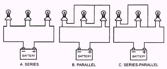 Figure 1-12.- Typical automotive circuit. Series circuits (fig. 1-13, view A). A series circuit consists of two or more electrical components connected in such a manner that current will flow through all the components. Important characteristics of a series circuit are as follows: Any break in the circuit (such as a burned-out light bulb) will render' the entire circuit inoperative. Current (amperage) will be constant throughout the circuit. Total resistance of the circuit is equal to the sum of each individual resistance. Total voltage of the circuit is equal to the sum of the individual voltage drops across each component. Parallel circuits (fig. 1-13, view B). A parallel circuit consists of two or more electrically operated components connected by parallel wires. In a parallel circuit, the current divides, part of it flowing into one component and part into the others. Practically the same voltage is applied to each component, and each component can be turned on or off independently of the others. Important characteristics of parallel circuits are as follows: The total resistance of the circuit will always be less than the resistance of any individual component. The disconnection or burning out of any individual component in the circuit will not affect the operation of the others. The current will divide itself among the circuit branches according to the resistance of the individual devices. The sum of the individual amperages will be equal to the total circuit current. The voltage will be constant throughout the circuit when measured across the individual branches. Series-parallel circuits (fig. 1-13, view C). The series-parallel circuit is a combination of the two configurations. There must be at least three resistance units to have a series-parallel circuit. Important characteristics of series-parallel circuits are as follows: The total circuit voltage will be equal to the sum of the total parallel circuit voltage drop plus the voltage drop of the individual series circuit component. The total circuit resistance will be equal to the sum of the total parallel circuit resistance plus the individual resistance of the series circuit components.