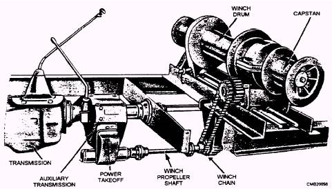 Figure 4-21.- Auxiliary transmission with power takeoff used for driving winch. Support and alignment are provided by a frame cross member. Rubber-mounting brackets are used to isolate vibration and noise from the chassis. A lever that extends into the operator's compartment accomplishes shifting. Like the main transmission, the auxiliary transmission may have either constant mesh gears or synchronizers to allow for easier shifting. This transmission, when of the two-speed design, has a low range and direct drive. Three-and four-speed auxiliary transmissions commonly have at least one overdrive gear ratio. The OVERDRIVE position causes increased speed of the output shaft in relation to the input shaft. Overdrive is common on heavy-duty trucks used to carry heavy loads and travel at highway speeds. The auxiliary transmission shown in figure 4-22 provides two-speed ratios. When it is in the DIRECT DRIVE position, power flows directly through the transmission and is controlled only by the main transmission. When the auxiliary transmission is shifted into LOW RANGE, vehicle speed is reduced and torque is increased. When the low range is used with the lowest speed of the main transmission, the engine drives the wheels very slowly and with less engine horsepower. In this constant mesh auxiliary transmission, the main gear is part of the input shaft, and it is in constant mesh with the countershaft drive gear. A pilot bearing aligns the main shaft output shaft with the input shaft. The low-speed main shaft gear runs free on the main shaft when direct drive is being used and is in constant mesh with the countershaft low-speed gear. A gear-type dog clutch, splined to the main shaft, slides forward or backward when you shaft the auxiliary transmission into high or low gear position. In HIGH GEAR, when direct drive from the main transmission is being used, the dog clutch is forward and makes a direct connection between the input shaft and the main shaft. When in LOW GEAR, the dog clutch is meshed with the low-speed, main shaft gear and is disengaged from the main drive gear. |