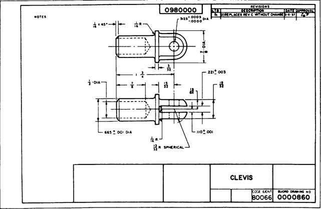Figure 3-25.-Detailed drawing of a clevis. detail view. A detail view shows part of a drawing in the same plane and in the same arrangement, but in greater detail to a larger scale than in the principal view. Figure 3-25 shows a relatively simple detail drawing of a clevis. Study the figure closely and apply the principles for reading two-view orthographic drawings discussed earlier in this chapter. The dimensions on the detail drawing in figure 3-25 are conventional, except for the four toleranced dimensions given. In the top view, on the right end of the part, is a hole requiring a diameter of 0.3125 +0.0005, but no - (minus). This means that the diameter of the hole can be no less than 0.3125, but as large as 0.3130. In the bottom view, on the left end of the part, there is a diameter of 0.665 0.001. This means the diameter can be a minimum of 0.664, and a maximum of 0.666. The other two toleranced dimension given are at the left of the bottom view. Figure 3-26 is an isometric view of the clevis shown in figure 3-25.