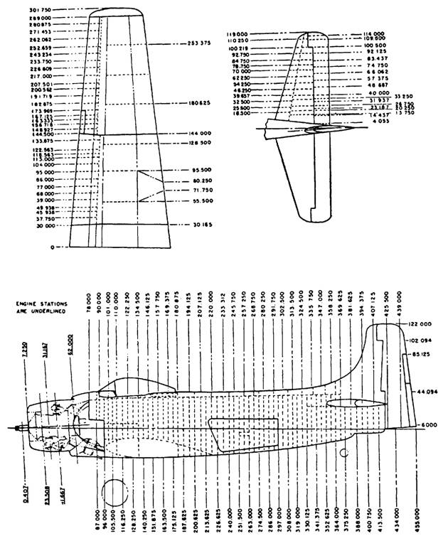 Figure 1-3.-Aircraft stations and frames. aircraft on one drawing may be taken as the zero station. Objects to the right or left of center along the wings or stabilizers are found by giving the number of inches between them and the centerline zero station. On other drawings, the zero station may be at the nose of the fuselage, at a firewall, or at some other location depending on the purpose of the drawing. Figure 1-3 shows station numbers for a typical aircraft. Bill of Material The bill of material block contains a list of the parts and/or material needed for the project. The block identifies parts and materials by stock number or other appropriate number, and lists the quantities requited. The bill of material often contains a list of standard parts, known as a parts list or schedule. Figure 1-4 shows a bill of material for an electrical plan. Application Block The application block on a blueprint of a part or assembly (fig. 1-5) identifies directly or by reference the larger unit that contains the part or assembly on the drawing. The NEXT ASS'Y (next assembly) column will contain the drawing number or model