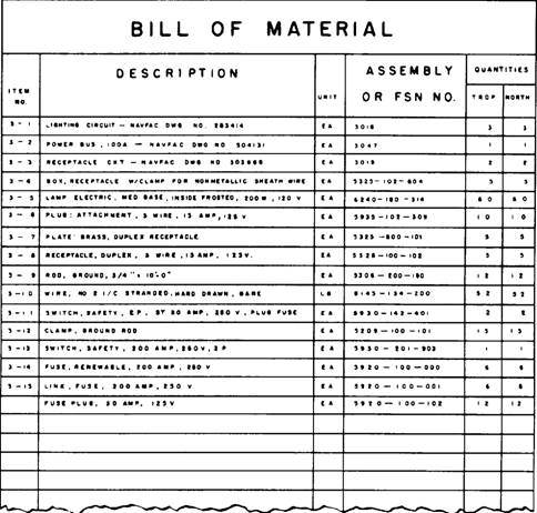Figure 1-4.-Bill of material. number of the next larger assembly of which the smaller unit or assembly is a part. The USED ON column shows the model number or equivalent designation of the assembled units part. |