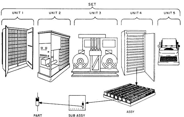 and the necessary assemblies, subassemblies, and parts connected or associated together to perform an operational function. Reference designations are assigned beginning with the unit and continuing down to the lowest level (parts). Units are assigned a number beginning with 1 and continuing with consecutive numbers for all units of the set. This number is the complete reference designation for the unit. If there is only one unit, the unit number is omitted. Assemblies and subassemblies are assigned reference designations consisting of the unit number that identifies the unit of which the assembly or subassembly is a part, the letter A indicating an assembly or subassembly, and a number identifying the specific assembly or subassembly as shown in figure 6-17. Parts are assigned reference designations that consist of the unit and assembly or subassembly designation, plus a letter or letters identifying the class to which the part belongs (as in the block numbering system), and a number identifying the specific part. For each additional subassembly, an additional letter A and number are added to the part reference designation. For example, if the resistor shown in figure 6-16 is the number 1 resistor in the subassembly, its complete reference designation would be 4A13A5AIR1. This number identifies the number 1 resistor on the number card of rack number 5 in assembly 13 of unit 4. On electronic diagrams, the usual procedure is to use partial (abbreviated) reference designations. In this procedure, only the letter and number identifying the part is shown on the part itself, while the reference designation prefix appears at some other place on the diagram as shown in figure 6-14. For the complete reference designation, the designation prefix precedes the partial designation. |