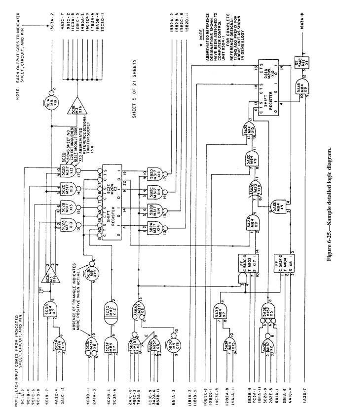 Basic Logic Diagrams Basic logic diagrams are used to show the operation of a particular unit or component. Basic logic symbols are shown in their proper relationship so as to show operation only in the most simplified form possible. Figure 6-24 shows a basic logic diagram for a serial subtractor. The operation of the unit is described briefly in the next paragraph. In the basic subtractor in figure 6-24, assume you want to subtract binary 011 (decimal 1) from binary 100 (decimal 4). At time 10, the 0 input at A and 1 input at B of inhibitor 11 results in a 0 output from inhibitor 11 and a 1 output from inhibitor 12. The 0 output from 11 and the 1 output from IZ are applied to OR gate Gl, producing a 1 output from Gl. The 1 output from IZ is also applied to the delay line. The I output from Gl along with the 0 output from the delay line produces 1 output from 13. The 1 input from Gl and the 0 input from the delay line produce a 0 output from inhibitor 14. The 0 output from L and the 1 output from 13 are applied to OR gate GZ producing a 1 output. At time tl the 0 inputs on the A and B input lines of h produce 0 outputs from h and 12. The 0 inputs on both input lines of OR gate Gl result in a 0 output from Gl. The I input applied to the delay line at time to emerges (1 bit time delay) and is now applied to the inhibit line of 13 producing an 0 output from 13. The 1 output from the delay line is also applied to inhibitor 14, and along with the 0 output from Gl produces a 1 output from 14. The 14 output is recycled back into the delay line, and also applied to OR gate GZ. As a result of the 0 and 1 inputs from 13, and 14, OR gate GZ produces a 1 output. At time tz, the 1 input on the A line and the 0 input on the B line of 11 produce a 1 output from 11 and a 0 output from 12. These outputs applied to OR gate G1 produce a 1 output from Gl, which is applied to 13 and 14- The delay line now produces a 1 output (recycled in at time tl), which is applied to 13 and 14. The 1 output from the delay line along with the 1 output from Gl produces a 0 output from 13. The 1 output from Gl along with the 1 output from the delay line produces a 0 output from 14- With 0 outputs from 13 and 14, OR gate GZ produces a 0 output. Detailed logic diagrams show all logic functions of the equipment concerned. In addition, they also include such information as socket locations, pin numbers, and test points to help in troubleshooting. The detailed logic diagram for a complete unit may consist of many separate sheets, as shown in the note on the sample sheet in figure 6-25. All input lines shown on each sheet of a detailed logic diagram are tagged to show the origin of the inputs. Likewise, all output lines are tagged to show