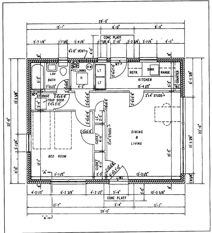LAYOUT DRAWINGS Layout drawings are also called general plans and profile drawings. They provide the necessary information on the location, alignment, and elevation of the structure and its principal parts in relation to the ground at the site. They also provide other important details, such as the nature of the underlying soil or the location of adjacent structures and roads. These drawings are supplemented by instructions and information known as written specifications. GENERAL PLANS General plans contain information on the size, material, and makeup of all main members of the structure, their relative position and method of connection, as well as the attachment of other parts of the structure. The number of general plan drawings supplied is determined by such factors as the size and nature of the structure, and the complexity of operations. General plans consist of plan views, elevations, and sections of the structure and its various parts. The amount of information required determines the number and location of sections and elevations. FABRICATION DRAWINGS Fabrication drawings, or shop drawings, contain necessary information on the size, shape, material, and provisions for connections and attachments for each member. This information is in enough detail to permit ordering the material for the member concerned and its fabrication in the shop or yard. Component parts of the members are shown in the fabrication drawing, as well as dimensions and assembly marks. ERECTION DRAWINGS Erection drawings, or erection diagrams, show the location and position of the various members in the finished structure. They are especially useful to personnel performing the erection in the field. For instance, the erection drawings supply the approximate weight of heavy pieces, the number of pieces, and other helpful data. FALSEWORK DRAWINGS The term falsework refers to temporary supports of timber or steel that sometimes are required in the erection of difficult or important structures. When falsework is required on an elaborate scale, drawings similar to the general and detail drawings already described may be provided to guide construction. For simple falsework, field sketches may be all that is needed. Construction drawings are those in which as much construction information as possible is presented graphically, or by means of pictures. Most construction drawings consist of orthographic views. General drawings consist of plans and elevations drawn on relatively small scale. Detail drawings consist of sections and details drawn on a relatively large scale; we will discuss detail drawing in greater depth later in this chapter. A plan view is a view of an object or area as it would appear if projected onto a horizontal plane passed through or held above the object area. The most common construction plans are plot plans (also called site plans), foundation plans, floor plans, and framing plans. We will discuss each of them in the following paragraphs. A plot plan shows the contours, boundaries, roads, utilities, trees, structures, and other significant physical features about structures on their sites. The locations of the proposed structures are indicated by appropriate outlines or floor plans. As an example, a plot may locate the comers of a proposed structure at a given distance from a reference or base line. Since the reference or base line can be located at the site, the plot plan provides essential data for those who will lay out the building lines. The plot also can have contour lines that show the elevations of existing and proposed earth surfaces, and can provide essential data for the graders and excavators. A foundation plan (fig. 7-9) is a plan view of a structure projected on a imaginary horizontal plane passing through at the level of the tops of the foundations. The plan shown in figure 7-9 tells you that the main foundation of this structure will consist of a rectangular 8-inch concrete block wall, 22 by 28 feet, centered on a concrete footing 10 inches wide. Besides the outside wall and footing, there will be two 12-inch square piers, centered on 18-inch square footings, and located 9 feet 6 inches from the end wall building lines. These piers will support a ground floor center-line girder. Figure 7-10 shows the development of a typical floor plan, and figure 7-11 shows the floor plan itself.