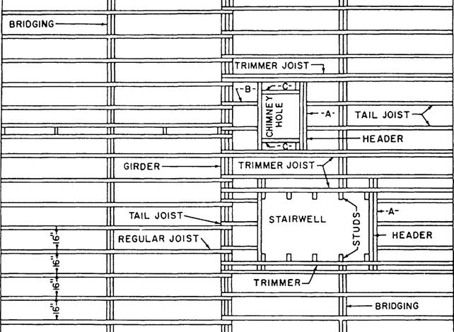 Figure 7-12.-Floor framing plan. Information on a floor plan includes the lengths, thicknesses, and character of the building walls on that particular floor, the widths and locations of door and window openings, the lengths and character of partitions, the number and arrangement of rooms, and the types and locations of utility installations. Framing plans show the dimension numbers and arrangement of structural members in wood-frame construction. A simple floor framing plan is superimposed on the foundation plan shown in figure 7-9. From this foundation plan you learn that the ground floor joists in this structure will consist of 2 by 8s, lapped at the girder, and spaced 16 inches on center (OC). The plan also shows that each row of joists is to be braced by a row of 1 by 3 cross bridges. More complicated floor framing problems require a framing plan like the one shown in figure 7-12. That plan, among other things, shows the arrangement of joists and other members around stairwells and other floor openings. A wall framing plan provides information similar to that in figure 7-11 for the studs, corner posts, bracing, sills, plates, and other structural members in the walls. Since it is a view on a vertical plane, a wall framing plan is not a plan in the strict technical sense. However, the practice of calling it a plan has become a general custom. A roof framing plan gives similar information with regard to the rafters, ridge, purlins, and other structural members in the roof. A utility plan is a floor plan that shows the layout of heating, electrical, plumbing, or other utility systems. Utility plans are used primarily by the ratings responsible for the utilities, and are equally important to the builder. Most utility installations require that openings be left in walls, floors, and roofs for the admission or installation of utility features. The builder who is placing a concrete foundation wall must study the utility plans to determine the number, sizes, and locations of openings he or she must leave for utilities. |