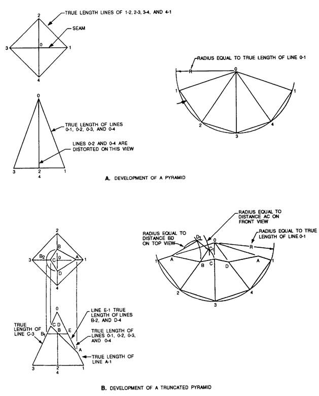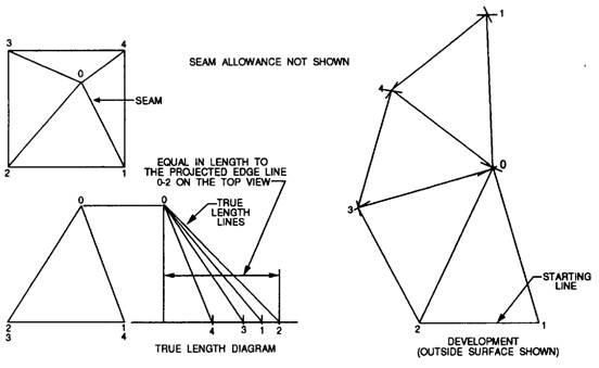Figure 8-10.-Development of an oblique pyramid by triangulation. Right Pyramid Construct a radial-line development of a triangle with a true length-of-edge line (fig. 8-9) and a right pyramid having all the lateral edges (from vertex to the base) of equal length. Since the true length of the lateral edges is shown in the front view (line (0-1 or 0-3) and the top view shows the true lengths of the edges of the base (lines 1-2, 2-3, and so on), the development may be constructed as follows: With 0 as center (corresponding to the apex) and with a radius equal to the true length of the lateral edges (line 0-1 in the front view), draw an arc as shown. Drop a perpendicular line from 0 to intersect the arc at point 3. With a radius equal to the length of the edge of the base (line 1-2 on the top view), start at point 3 and step off the distances 3-2, 2-1, 3-4, and 4-1 on the large arc. Join these points with straight lines. Then connect the points to point 0 by a straight line to complete the development. Lines 0-2, 0-3, and 0-4 are the fold lines on which the development is folded to shape the pyramid The base and seam allowance have been omitted for clarity. Oblique Pyramid The oblique pyramid in figure 8-10 has all its lateral edges of unequal length. The true length of each of these edges must first be found as shown in the true-length diagram. The development may now be constructed as follows: Lay out base line 1-2 in the development view equal in length to base line 1-2 found in the top view. With point 1 as center and a radius equal in length to line 0-1 in the true diagram, swing an arc. With point 2 as center and a radius equal in length to line 0-2 in the true-length diagram, swing an arc intersecting the first arc at 0. With point 0 as center and a radius equal in length to line 0-3 in the true-length diagram, swing an arc. With point 2 as center and radius equal in length to base line 2-3 found in the top view, swing an arc intersecting the first arc at point 3. Locate points 4 and 1 in a similar manner, and join those points, as shown, with straight lines. The base and seam lines have been omitted on the development drawing. Truncated Pyramid Figure 8-11 shows a truncated pyramid that is developed in the following manner: Look at the views in figure 8-11 as you read the explanation. Draw the orthographic views, extending the lines of the sides to the apex at the top in view A. Draw three horizontal construction lines on the right side of the orthographic view (view B), one from the center of the top view; one from the top of the front view; and one from the bottom of the front view. With the point of the compass in the center of the top view, scribe two arcs (view C). Draw one from the inside corner of the top view to the horizontal line (point W), and the other from the outside corner of the top view to the horizontal line (point X). Draw two vertical lines, one from point W in