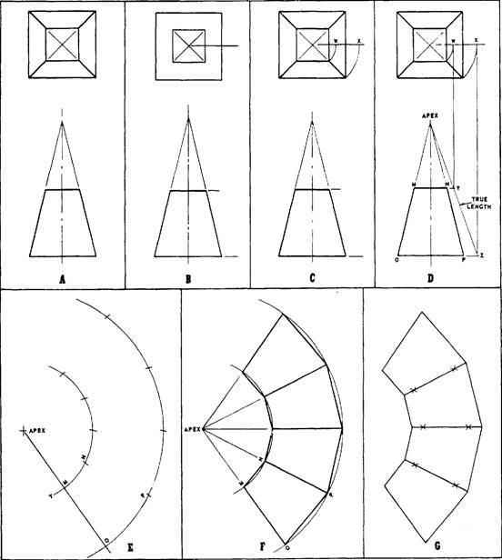 Figure 5-11.-Development of a truncated pyramid. view D to the upper horizontal line on the front view (point Y), and the other from X to the lower horizontal line of the front view (point 2). Draw a line from the apex through points Y and 2 in view D. The distance between points Y and Z equals the true length of the truncated pyramid With the compass point at the apex of view E, find any convenient point to the right of the orthographic view, scribe an are with a radius equal to the distance between the apex and point Y in view D, and a second arc with a radius equal to the distance between the apex and point Z in view D. The two arcs are shown in view E. Draw a radial line beginning at the apex and cutting across arcs Y and Z in view E. Step off lengths along these arcs equal to the length of the sides of the pyramid: MN for the inside arc and OP for the outside arc (view E); the lengths MN and OP are taken from the orthographic view in view D. Connect the points along each arc with heavy lines (for example, points MN along the inner arc and points OP along the outer arc); Also use light lines to connect the apex with points M and 0, and the apex with points N and P, and so on, as shown in view F. View G is the completed stretchout of a truncated pyramid complete with bend lines, which are marked (X). |