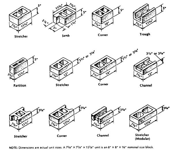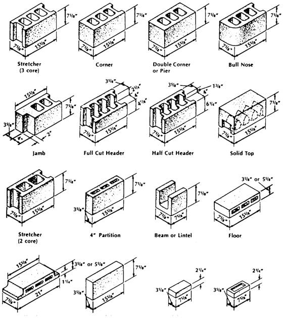 Figure 8-4.-Typical unit sizes and shapes of concrete masonry units. Fire walls and curtain walls; Partitions and panel walks; Backing for brick, stone, and other facings; Fireproofing over structural members; Fire safe walls around stairwells, elevators, and enclosures; Piers and columns; Retaining walls; Chimneys; and Concrete floor units. There are five main types of concrete masonry units: 1. Hollow load-bearing concrete block; 2. Solid load-bearing concrete block; 3. Hollow nonload-bearing concrete block; 4. Concrete building tile; and 5. Concrete brick. Load-bearing blocks are available in two grades: N and S. Grade N is for general use, such as exterior walls both above and below grade that may or may not be exposed to moisture penetration or weather. Both grades are also used for backup and interior walls. Grade S is for above-grade exterior walls with a weather-protective coating and for interior walls. The grades are further subdivided into two types. Type I consists of moisture-controlled units for use in arid climates. Type II consists of nonmoisturecontrolled units.