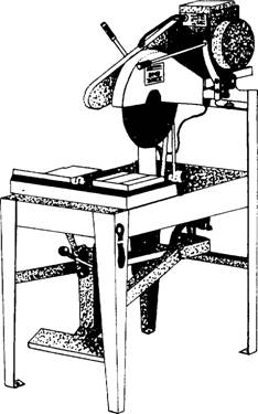 Figure 8-5.-Masonry saw. using mortar having good water retentivity, using the proper grade of sand, and thorough mixing. You do not obtain good plasticity by using a lot of cementitious materials. Mortar properties depend largely upon the type of sand it contains. Clean, sharp sand produces excellent mortar, but too much sand causes mortar to segregate, drop off the trowel, and weather poorly. Water Retentivity Water retentivity is the mortar property that resists rapid loss of water to highly absorbent masonry units. Mortar must have water to develop the bond. If it does not contain enough water, the mortar will have poor plasticity and workability, and the bond will be weak and spotty. Sometimes, you must wet brick to control water absorption before applying mortar, but never wet concrete masonry units. Mortar Strength and Durability The type of service that the masonry must give determines the strength and durability requirements of mortar. For example, walls subject to severe stress or weathering must be laid with more durable, stronger mortar than walls for ordinary service. Table 8-1 gives mortar mix proportions that provide adequate mortar strength and durability for the conditions listed. Types of Mortar The following mortar types are proportioned on a volume basis: Type M- One part portland cement, one-fourth part hydrated lime or lime putty, and three parts sand; or, one part portland cement, one part type II masonry cement, and six parts sand. Type M mortar is suitable for general use, but is recommended specifically for below-grade masonry that contacts earth, such as foundations, retaining walls, and walks. Type S- One part portland cement, one-half part hydrated lime or lime putty, and four and one-half parts sand; or, one-half part portland cement, one part type II masonry cement, and four and one-half parts sand. Type S mortar is also suitable for general use, but is recommended where high resistance to lateral forces is required. Table 8-l.-Recommended Mortar Mix Proportions by Unit Volume