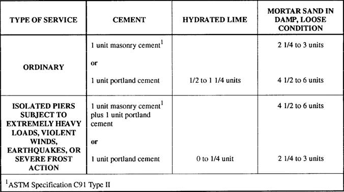 Type N- One part portland cement, one part hydrated lime or lime putty, and six parts sand; or, one part type II masonry cement and three parts sand. Type N mortar is suitable for general use in above-grade exposed masonry where high compressive or lateral strength is not required. Type O- One part portland cement, two parts hydrated lime or lime putty, and nine parts sand; or, one part type I or type II masonry cement and three parts sand. Type 0 mortar is recommended for load-bearing, solid-unit walls when the compressive stresses do not exceed 100 pounds per square inch (psi) and the masonry is not subject to freezing and thawing in the presence of a lot of moisture. |