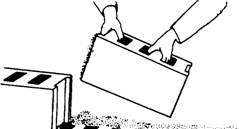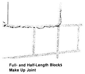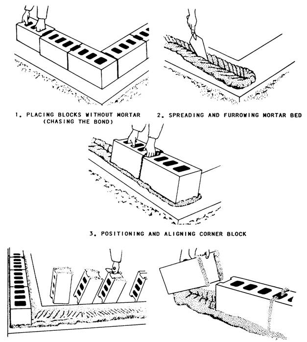SAFE HANDLING OF MATERIAL When you handle cement or lime bags, wear goggles and snug-fitting neckbands and wristbands. Always practice good personal cleanliness and never wear clothing that has become stiff with cement. Cement-impregnated clothing irritates the skin and may cause serious infection. Any susceptibility of the skin to cement and lime burns should be reported. Personnel who are allergic to cement or lime should be transferred to other jobs. Bags of cement or lime should not be piled more than 10 bags high on a pallet. The only exception is when storage is in bins or enclosures built for such storage. The bags around the outside of the pallet should be placed with the mouths of the bags facing the center, The first five tiers of bags each way from any corner must be cross piled. A setback starting with the sixth tier should be made to prevent piled bags from falling outward. If you have to pile bags above 10 tiers, another setback must be made. The back tier, when not resting against an interior wall of sufficient strength to withstand the pressure, should be set back one bag every five tiers, the same as the end tiers. During unpiling, the entire top of the pile should be kept level and the necessary setbacks maintained. Lime and cement must be stored in a dry place. This helps prevent lime from crumbling and the cement from hydrating before it is used. CONCRETE MASONRY CONSTRUCTION LEARNING OBJECTIVE: Upon completing this section, you should be able to explain the elements of concrete masonry Good workmanship is a very important factor in building masonry walls. You should make every effort to lay each masonry unit plumb and true. In the following paragraphs, we will discuss the basic steps in laying up masonry walls. STEPS IN CONSTRUCTION The first step in building a concrete masonry wall is to locate the corners of the structure. In locating the corners, you should also make sure the footing or slab formation is level so that each Builder starts each section wall on a common plane. This also helps ensure that the bed joints are straight when the sections are connected. If the foundation is badly out of level, the entire first course should be laid before Builders begin working on other courses. If this is not possible, a level plane should be established with a transit or engineer's level. The second step is to chase out bond, or lay out, by placing the first course of blocks without mortar (figure 8-7, view 1). Snap a chalk line to mark the