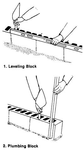 Figure 8-8.-Leveling and plumbing first course of blocks for a wall. footing and align the blocks accurately. Then, use a piece of material 3/8 inch thick to properly space the blocks. This helps you get an accurate measurement. The third step is to replace the loose blocks with a full mortar bed, spreading and furrowing it with a
