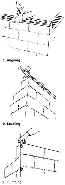 Figure 8-10.-Checking each course at the corner. trowel to ensure plenty of mortar under the bottom edges of the first course (figure 8-7, view 2). Carefully position and align the corner block first (view 3 of figure 8-7). Lay the remaining first-course blocks with the thicker end up to provide a larger mortar-bedding area. For the vertical joints, apply mortar only to the block ends by placing several blocks on end and buttering them all in one operation (view 4). Make the joints 3/8 inch thick. Then, place each block in its final position, and push the block down vertically into the mortar bed and against the previously laid block. This ensures a well-tilled vertical mortar joint (view 5). After laying three or four blocks, use a mason's level as a straightedge to check correct block alignment (figure 8-8, view 1). Then, use the level to bring the blocks to proper grade and plumb by tapping with a trowel handle as shown in view 2. Always lay out the first course of concrete masonry carefully and make sure that you properly align, level, and plumb it. This assures that succeeding courses and the final wall are both straight and true. The fourth step is to build up the corners of the wall, usually four or five courses high. This is also called laying up a lead. Step back each course one-half block. For the horizontal joints, apply mortar only to the tops of the blocks already laid. For the vertical joints, you can apply mortar either to the ends of the new block or the end of the block previously laid, or both, to ensure well-filled joints (figure 8-9). As you lay each course at the corner, check the course with a level for alignment (figure 8-10, view 1), for level (view 2), and for