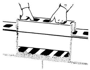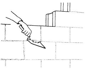 Figure 8-15.-Cutting off excess mortar from the joints. any mortar falls out, leaving an open joint, remove the block and repeat the procedure. To assure a good bond, do not spread mortar too far ahead when actually laying blocks. If you do, the mortar will stiffen and lose its plasticity. The recommended width of mortar joints for concrete masonry units is 3/8 inch. When properly made, these joints produce a weathertight, neat, and durable concrete masonry wall. As you lay each block, cut off excess mortar from the joints using a trowel (figure 8-15) and throw it back on the mortar board to rework into the fresh mortar. Do not, however, rework any mortar dropped on the scaffold or floor. Weathertight joints and the neat appearance of concrete masonry walls depend on proper striking (tooling). After laying a section of the wall, tool the mortar joint when the mortar becomes "thumb print" hard. Tooling compacts the mortar and forces it tightly against the masonry on each side of the joint. Use either concave or V-shaped tooling on all joints (figure 8-16). Tool horizontal joints (figure 8-17, view 1) with a long jointer first, followed by tooling the vertical joints (view 2). Trim off mortar burrs from the tooling flush with the wall face using a trowel, soft bristle brush, or by rubbing with a burlap bag.