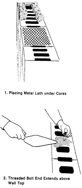 Figure 8-18.-Installing anchor bolts for wood plates. in the second horizontal mortar joint from the top of the wall under the cores that will contain the bolts (figure 8-18, view 1). Use anchor bolts 1/2 inch in diameter and 18 inches long. Space them not more than 4 feet apart. Then, when you complete the top course, insert the bolts into the cores of the top two courses and till the cores with concrete or mortar. The metal lath underneath holds the concrete or mortar filling in place. The threaded end of the bolt should extend above the top of the wall (view 2).