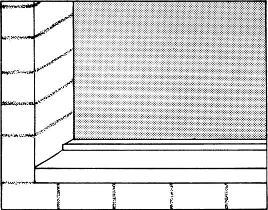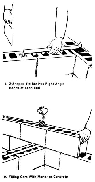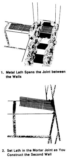 Figure 8-22.-Tying intersecting bearing walls. Space the tie bars no more than 4 feet apart vertically and place pieces of metal lath under the block cores that will contain the tie bars ends (figure 8-18, view 1). Embed the right-angle bends in the cores by filling them with mortar or concrete (figure 8-22, view 2). Nonload-bearing Walls To join intersecting nonload-bearing block walls, terminate one wall at the face of the second with a control joint. Then, place strips of metal lath of