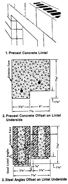Figure 8-24.-Lintel made from blocks. 1/4-inch mesh galvanized hardware cloth across the joint between the two walls (figure 8-23, view 1) in alternate courses. Insert one-half of the metal stops into one wall as you build it, and then tie the other halves into the mortar joints as you lay the second wall (view 2).