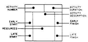 PRECEDENCE DIAGRAMS Scheduling involves putting the network on a working timetable. Information relating to each activity is contained within an activity box, as shown in figure 9-19. Forward and Backward Pass Calculations To place the network on a timetable, you must make time and duration computations for the entire project. These computations establish the critical path and provide the start and finish dates for each activity. Each activity in the network can be associated with four time values: 0 Early start (ES)- Earliest time an activity may be started;