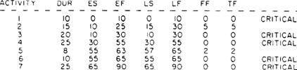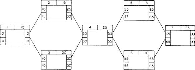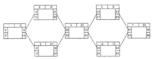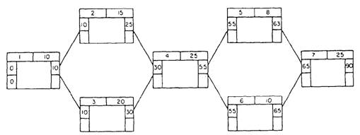Figure 9-20.-Example of forward-pass calculations. Early finish (EF)- Earliest time an activity may be finished; Late start (LS)- Latest time an activity may be started and still remain on schedule; and Late finish (LF)- Latest time an activity may be finished and still remain on schedule. The main objective of forward-pass computations is to determine the duration of the network. The forward pass establishes the early start and finish of each activity and determines the longest path through the network (critical path). The common procedure for calculating the project duration is to add activity durations successively, as shown in figure 9-20, along chains of activities until a merge is found. At the merge, the largest sum entering the activity is taken at the start of succeeding activities. The addition continues to the next point of merger, and the step is repeated. The formula for forward-pass calculations is as follows: ES = EF of preceding activity EF = ES + activity duration The backward-pass computations provide the latest possible start and finish times that may take place without altering the network relationships. These values are obtained by starting the calculations at the last activity in the network and working backward, subtracting the succeeding duration of an activity from the early finish of the activity being calculated. When a "burst" of activities emanating from the same activity is encountered, each path is calculated. The smallest or multiple value is recorded as the late finish. The backward pass is the opposite of the forward pass. During the forward pass, the early start is added to the activity duration to become the early finish of that activity. During the backward pass, the activity duration is subtracted from the late finish to provide the late start time of that activity. This late start time then becomes the late finish of the next activity within the backward flow of the diagram. LS = LF - activity duration Figure 9-21 shows a network with forward- and backward-pass calculations entered.