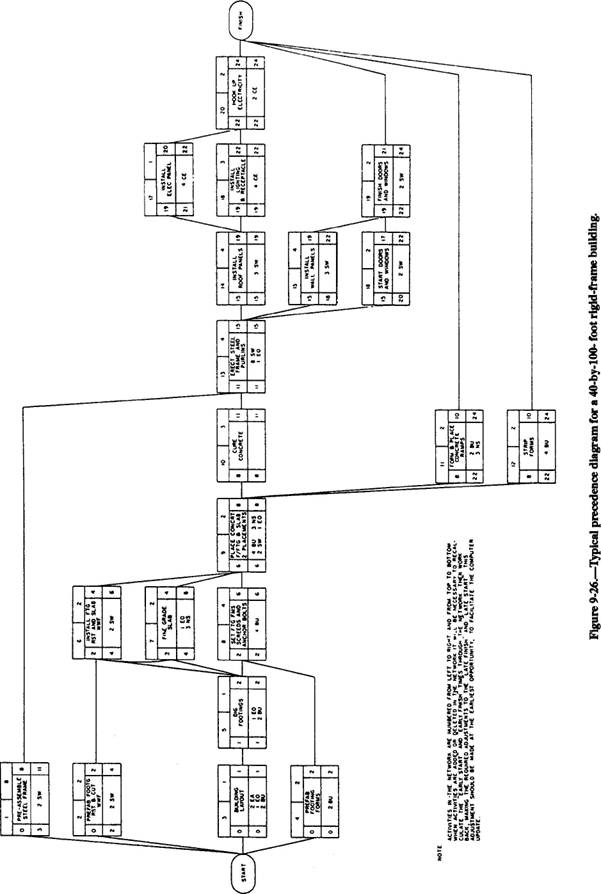 draw connector lines. Figure 9-26 shows a typical precedence diagram for a 40-by- 100-foot rigid-frame building. RECOMMENDED READING LIST NOTE Although the following references were current when this TRAMAN was published, their continued currency cannot be assured. You therefore need to ensure that you are studying the latest revision. Facilities Planning Guide, NAVFAC P-437, Naval Facilities Engineering Command, Alexandria, Va., 1982. Operations Officer's Handbook, COMCBPAC/ COMCBLANTINST 5200.2A, Commander, Naval Construction Battalions, U.S. Pacific Fleet, Pearl Harbor, Hawaii, and Commander, Naval Construction Battalions, U.S. Atlantic Fleet, Norfolk, Va., 1988. Seabee Planner's and Estimator's Handbook, NAVFAC P-405, Chapter 5, Naval Facilities Engineering Command, Alexandria, Va., 1983. |