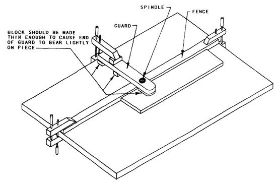 Figure 3-14.-Shaper table showing straightedge fence and guard. Portable Electric Circular Saw The portable electric circular saw is used chiefly as a great labor-saving device in sawing wood framing members on the job. The size of a circular saw is determined by the diameter of the largest blade it can use. The most commonly used circular saws are the 7 1/4- and 8 1/4-inch saws. There are two different types of electric saws, as shown in figure 3-15: the side-drive (view A) and the