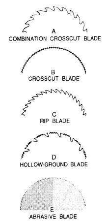 Figure 3-16.-Circular saw blades. ABRASIVE BLADES.- Abrasive blades are used for cutting metal, masonry, and plastics. These blades are particularly useful for scoring bricks so they can be easily split. Figure 3-17 shows how versatile the circular saw can be. To make an accurate ripping cut (view A), the