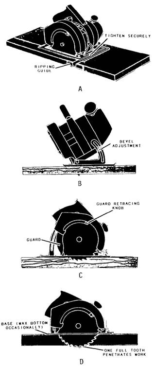 Figure 3-17.-Different ways to use a circular saw. ripping guide is set a distance away from the saw equal to the width of the strip to be ripped off. It is then placed against the edge of the piece as a guide for the saw. To make a bevel angle cut up to 45 (view B), you just set the bevel adjustment knob to the angle you want and cut down the line. To make a pocket cut (views C and D), a square cut in the middle of a piece of material, you retract the guard back and tilt the saw so that it rests on the front of the base. Then, lowering the rear of the saw into the material, hold it there until it goes all the way through the wood. Then, follow your line. Observe the following safety precautions when operating a circular saw: Don't force the saw through heavy cutting stock. If you do, you may overload the motor and damage it. Before using the saw, carefully examine the material to be cut and free it of nails or other metal objects. Cutting into or through knots should be avoided, if possible. Disconnect the saw from its power source before making any adjustments or repairs to the saw. This includes changing the blade. Make sure all circular saws are equipped with guards that automatically y adjust themselves to the work when in use so that none of the teeth protrude above the work. Adjust the guard over the blade so that it slides out of its recess