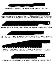 Figure 3-19.-Saber saw blades. gripping the tool, which will be affected somewhat by the particular tool you are using. On some tools, for example, you will find guiding easier if you apply some downward pressure on the tool as you move it forward. If you don't use a firm grip, the tool will tend to vibrate excessively and roughen the cut. Do not force the cutting faster than the design of the blade allows or you will break the blade. You can make a pocket cut with a saber saw just like you can with a circular saw, although you need to drill a starter hole to begin work. A saber saw can also make bevel-angle and curve cuts. Observe the following safety precautions when operating the saber saw: Before working with the saber saw, be sure to remove your rings, watches, bracelets, and other jewelry. If you are wearing long sleeves, roll them up. Be sure the saber saw is properly grounded. Use the proper saw blade for the work to be done, and ensure the blade is securely locked in place. Be sure the material to be cut is free of any obstructions. Keep your full attention focused on the work being performed. Grip the handle of the saw firmly. Control the forward and turning movements with your free hand on the front guide. To start a cut, place the forward edge of the saw base on the edge of the material being worked, start the motor, and move the blade into the material. Portable Reciprocating Saw The portable reciprocating saw (saw-all) (figure 3-20) is a heavy-duty power tool that you can use for a variety of woodworking maintenance work, remodeling, and roughing-in jobs. You can use it to cut rectangular openings, curved openings, along straight or curved lines, and flush. Blades for reciprocating saws are made in a great variety of sizes and shapes. They vary in length from 2 1/2 to 12 inches and are made of high-speed steel or carbon steel. They have cutting edges similar to those shown in figure 3-19.
