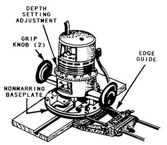 Figure 3-2l.-Portable router with edge guide. Place the foot of the saw firmly on the stock before starting to cut. Don't cut curves shaper than the blade can handle. When cutting through a wall, make sure you don't cut electrical wires. |