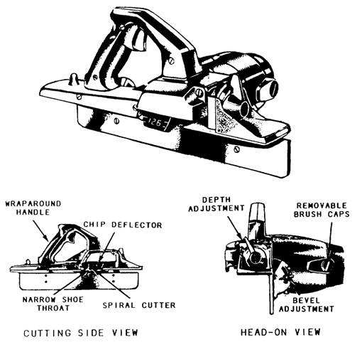 Figure 3-22: Router bits. Portable Power Plane The portable electric power plane (figure 3-23) is widely used for trimming panels, doors, frames, and so forth. It is a precision tool capable of exact depth of cut up to 3/16 inch on some of the heavier models. However, the maximum safe depth of cut on any model is 3/32 inch in any one pass. The power plane is essentially a high-speed motor that drives a cutter bar, containing either straight or spiral blades, at high speed. Operating the power plane is simply a matter of setting the depth of cut and passing the plane over the work. First, make careful measurements of the piece, where it is to fit, and determine how much material has to be removed. Then, the stock being planed should be held in a vise, clamped to the edge of a bench, or otherwise firmly held. Check the smoothness and straightness of all the edges. If a smoothing cut is desired, make that cut first and then recheck the dimensions. Make as many passes as necessary with the plane to reach the desired dimensions, checking frequently so as not to remove too much material. The greater the depth of the cut, the slower you must feed the tool into the work. Feed pressure should be enough to keep the tool cutting, but not so much as to slow it down excessively. Keep wood chips off the work because they can mar the surface of the stock as the tool passes over them. Keep your hands away from the butterhead or blades when a cut is finished. The L-shaped base, or fence, of the plane should be pressed snugly against the work when planing, assuring that the edge will be cut square. For bevel cuts, loosen the setscrew on the base, set the base at the desired bevel, and then retighten the setscrew.