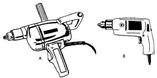 Figure 3-24: Heavyduty 1/2-inch portable drill (view A) and light-duty l/2-inch portable drill (view B). Observe the following safety precautions when operating a portable power plane: Make sure that the plane is turned off before plugging it in. Make sure you disconnect the plug before making any adjustment. Don't attempt to power plane with one hand-you need two. Always clamp your work securely in the best position to perform the planing. When finished planing, make sure you disconnect the power cord. |