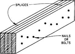 LAMINATED LUMBER Laminated lumber (figure 3-29) is made of several pieces of lumber held together as a single unit, a process called lamination. Usually 1 1/2-inches thick, the pieces are nailed, bolted, or glued together with the grain of all pieces running parallel. Laminating greatly increases the load-carrying capacity and rigidity of the weed. When extra length is needed, the pieces are spliced-with the splices staggered so that no two adjacent laminations are spliced at the same point. Built-up beams and girders are examples. They are built as shown in figure 3-30, usually nailed or bolted together, and spliced. Lamination can be used independently or with other materials in the construction of a structural unit. Trusses can be made with lamination for the chords and sawed
