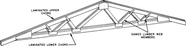 Figure 3-31.-Truss using laminated and sawed lumber. lumber, or for the web members (figure 3-31). Special beams can be constructed with lamination for the flanges and plywood or sawed lumber, for the web, as shown in figure 3-32. Units, such as plywood box beams and stressed skin panels, can contain both plywood and lamination (figure 3-33). Probably the greatest use of lamination is in the fabrication of large beams and arches. Beams with spans in excess of 100 feet and depths of 8 1/2 feet have been constructed using 2-inch boards. Laminations this large are factory produced. They are glued together under pressure. Most laminations are spliced using scarf joints (figure 3-34), and the entire piece is dressed to ensure uniform thickness and